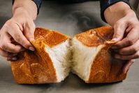 両手で食パンを半分に割っている