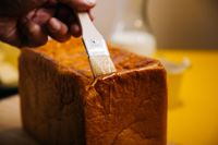 食パンにハケでバターを塗っている