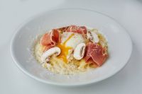 お皿に生ハムとマッシュルームののったカルボナーラが入っている