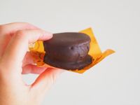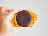 パッケージから取り出したチョコクッキーサンドを手で持った様子