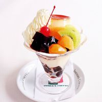 パフェグラスにプリン、コーヒーゼリー、フルーツが入って置いてある