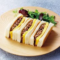 お皿のうえにすき焼きと卵焼きのサンドイッチがのって置いてある