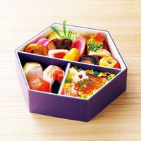 お弁当箱の中に手まり寿司やちらし寿司などが入って置いてある