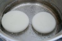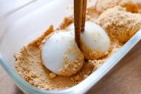 きな粉が入っている容器のなかで、餅を箸で分割する様子