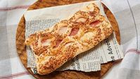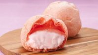 木のプレートの上に半分にカットされた「 もこもっ(苺レアチーズクリーム)」がのっている