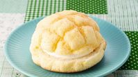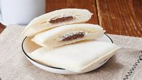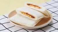 お皿の上に半分にカットされたプリン風味のランチパックがのっている