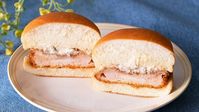 お皿の上に半分にカットされたえびかつバーガーがのっている