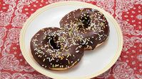 お皿の上にチョコレートのかかったドーナツが2個のっている