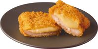 黒いお皿の上に、半分に割られた「ハーブ香る クワトロチーズ イン ファミチキ」がひとつのっている