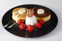 お皿の上にパンケーキといちご、マカロンがのっている