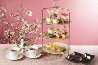 3段のケーキスタンドに、桜をテーマにしたスイーツがいくつも並べられ、その横にはティーポットやティーカップが置かれている