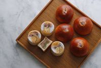 正方形のウッドトレーの上に、平たいあんぱん4個と、ふっくら丸いあんぱん4個が並べられている