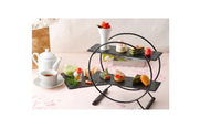 黒いケーキスタンドに、桜をテーマにしたスイーツが並べられ、その奥には、桜スイーツが並べられた黒いプレートが置かれている
