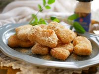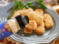 「プリンクルパウダー」を振りかけたチキンナゲットをフォークで刺しているところ