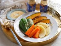 ライトブルーのプレートに盛ったグリル野菜、「プリンクルパウダー」、フォークなどのテーブルコーディネート
