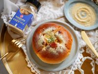 「プリンクルパウダー」を振りかけたマヌルパンと小皿に出した同パウダー、ボトルのテーブルコーディネート