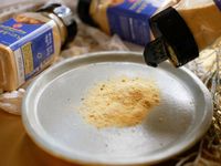 グレーのオーバル皿にのったチキンナゲットに「プリンクルパウダー」をかけている様子