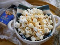 ストライプ模様のペーパーナプキンのひかれた白い器に山盛りポップコーンが入っているところ