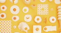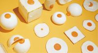 いくつもの小さな目玉焼きオブジェが、パズルのように組み合わされた状態で、黄色い台紙の上に置かれている