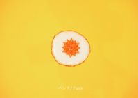 黄身のまわりを大きな白身で囲んだ目玉焼きのオブジェが、黄色い台紙の上に置かれている