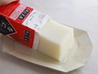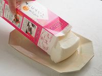 業務スーパーのパンナコッタが入ったパックを皿に向かって傾ける様子