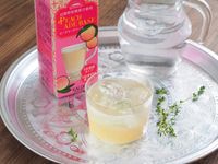 ピーチエードを注いだグラスとピーチエードベースのパック