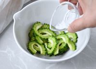 ボウルに入れたゴーヤに塩をかけているところ