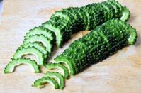 まな板の上に並べたスライスゴーヤ