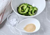 ボウルに入ったゴーヤ、器に入れた砂糖と塩