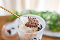 ファミリーマートのたべる牧場パフェをスプーンですくっているところ