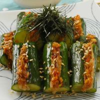 皿に盛られたきゅうりのオイ豚キムチ