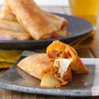 皿に盛られた豚キムチーズ春巻き