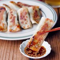 豚キムチ棒餃子に酢醤油をつけている