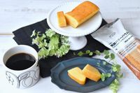 カッティングボードと皿にのせた発酵バターバウム、パッケージ