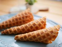 3個の「TUTTO(トゥット)」のヴィーガンワッフルコーンが青い皿の上に並んでいる様子