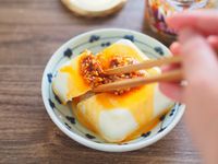 食べるナッツソースをかけた冷奴を箸で切る様子