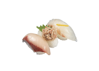 活〆寒ぶり、蟹みそ和え、柚子塩活〆真鯛の握り寿司が置いてある