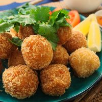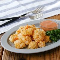 グレーの皿に盛り付けたポップコーンシュリンプ