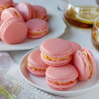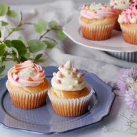グレーと白の皿に盛られた、デコレーションカップケーキ