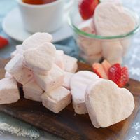 木製のトレーと透明な器に並べた、ハート形のマシュマロ