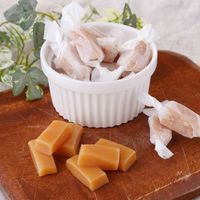紙で包んで白い器に入ったり、木製のトレーにのせたりしたキャラメル