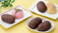お皿の上に「ぼたもち」、「道明寺」、「ぼたもち(つぶ・きなこ)」、「ぼたもちつぶあん」がのっている