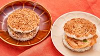お皿の上に「ライスバーガー 牛焼肉マヨ」と「ライスバーガー 海鮮かき揚げ」がのっている