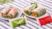 お皿の上に「生春巻サーモン(わさびドレッシング)」と「生春巻えび(スイートチリソース)」がのっている