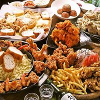 チーズボールやフライドチキンなどの韓国料理が並んでいる