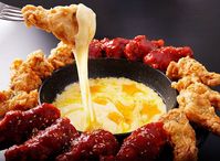 溶けたチーズにフライドチキンをくぐらせている