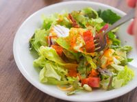 ドレッシングをかけたレタスをフォークで刺す様子
