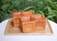お盆の上にキューブ型の食パンが4個並んでいる