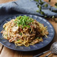 平皿に盛られ、小口ねぎをトッピングしたきのこと豚肉の春雨煮