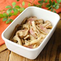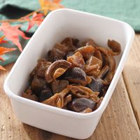 白い保存容器に盛られた、こんにゃくときのこの甘辛煮